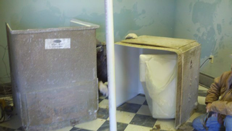 Cut the shower stall in half, bring it into the building, and then repair it. We refinished the seam and buffed it out, then installed the new shower.